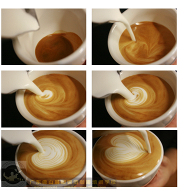 5. 九分滿時逐漸拉高奶缸,收細奶流,并向前拉,完成圖 6 種葉柄效果。