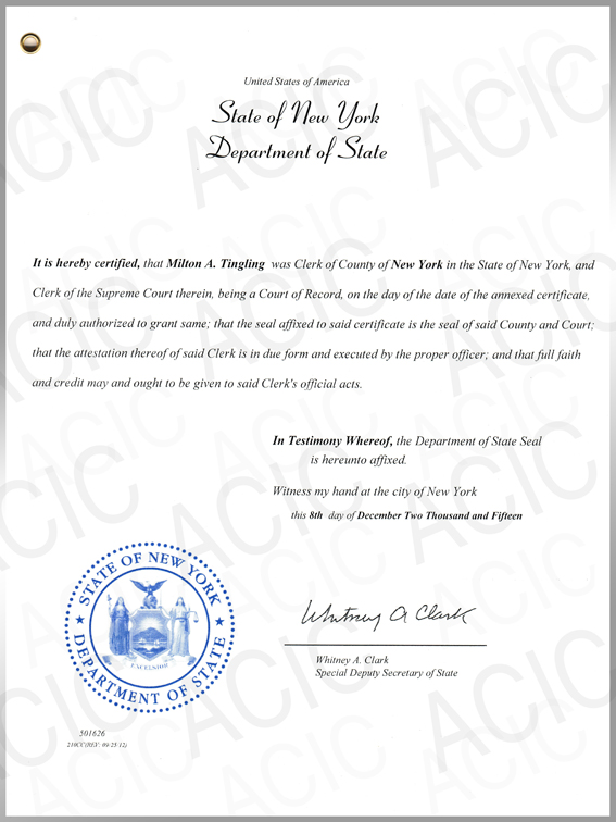 美國紐約州政府及特別州務卿Whitney A.Clark頒發的公證書