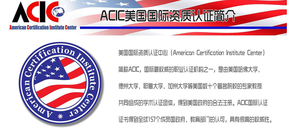 美國國際資質認證中心(ACIC)是由美國哈佛大學、德州大學、耶魯大學、加州大學、杜克大學、森坦那瑞商學院等美國數十個著名院校的專家教授共同組成的學術認證團體,在全球范圍內從事國際職業資格認證的專業機構,長期致力于專家級高水平認證、考試服務,得到美國政府的合法注冊,所有課程均獲得了美國教育部的認可,在全球各地教育培訓中心的教學活動均符合美國聯邦政府教育部和各州法律規定的要求。