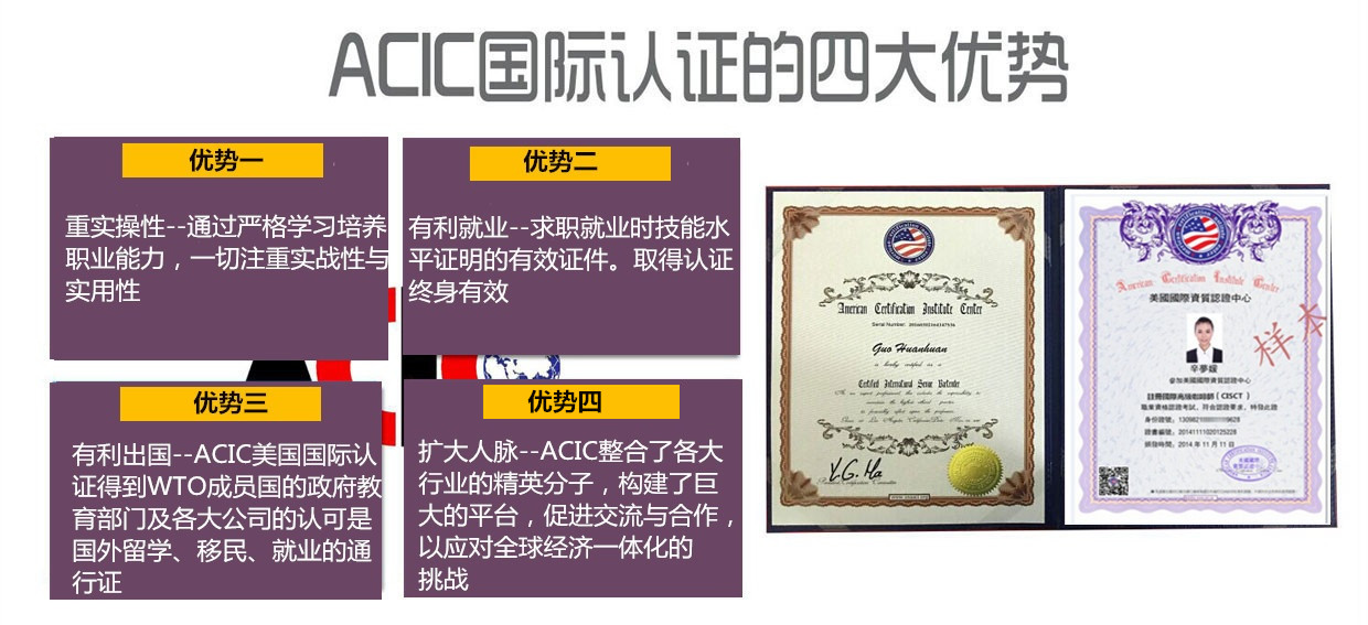 ACIC認證代表了當今職業資格認證的國際水平,客觀地評價從事相關行業人員的專家級的知識和能力水平,取得認證對個人有四大益處:一是培養能力:即通過嚴格學習,培養相關職業的實際能力,代表該領域內得到專業水準;二是有利出國:ACIC認證資格得到WTO成員國的政府、教育部門及各大公司的認可;三是有利就業:ACIC認證培訓,一切注重實戰性與實用性,引導當今培訓新潮流,符合全球經濟一體化化對人才的需求,取得認證,終身有效,可以在各類公司及政府部門謀職,有利于您在各行業脫穎而出。同時ACI為所有通過認證者備案,利用廣泛的渠道,加強交流與合作,選拔優秀者。四 擴大人脈圈:ACIC整合了各個行業的精英分子,構建了巨大的平臺,促進交流與合作,以應對全球經濟一體化的挑戰。